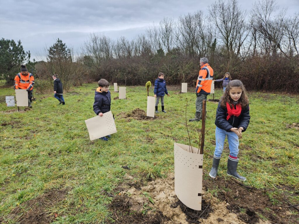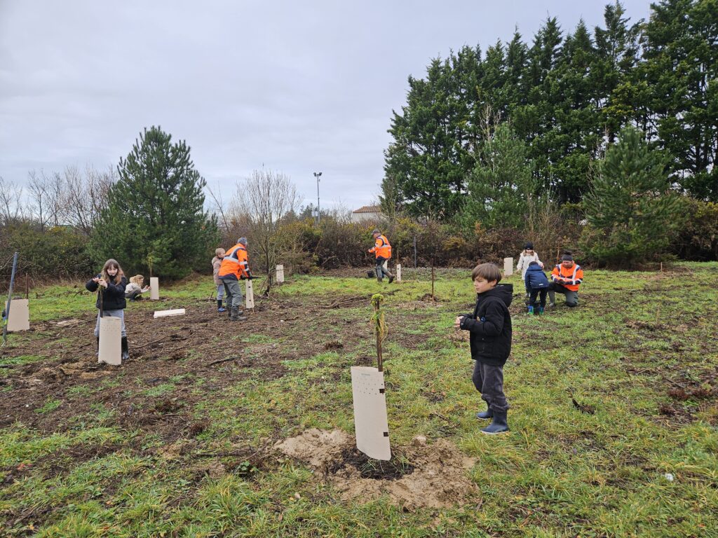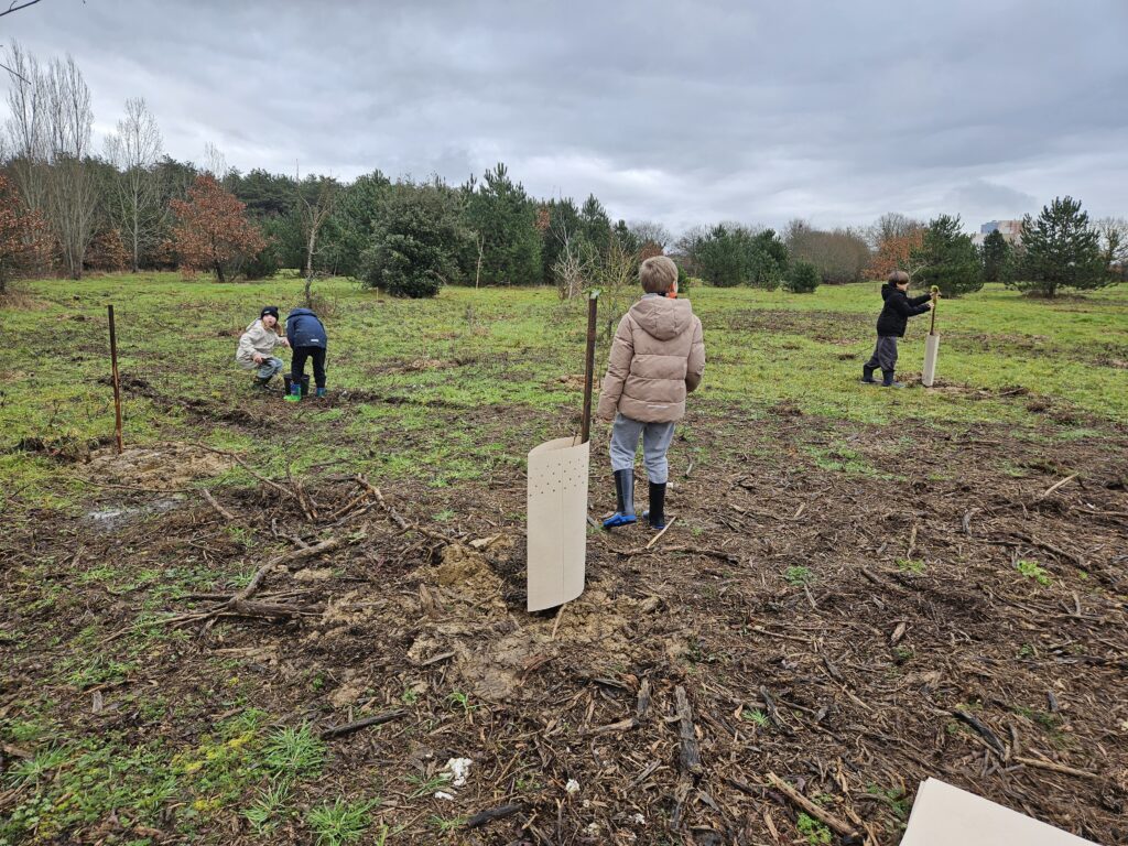 Hier après-midi, nous sommes allés en car dans le quartier des Fontaines. Nous avons revu avec Justine comment planter un arbre et les outils nécessaires. Nous avons reçu chacun un arbre avec un emplacement. On a planté différentes variétés : chêne, aulne, saule, sorbiers, châtaigner.